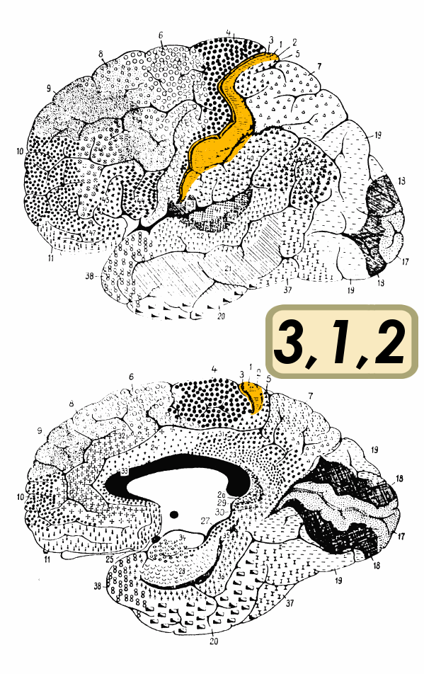 ・3a野、3b野、1野、2野の4つのサブ領域から成り、手足や顔など各部位の触覚、痛覚、温度覚、深部感覚を最初に受け取る