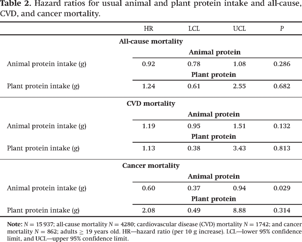 (HR = 0.95, P = 0.04)。植物性たんぱく質には関連なし(HR = 1.08, P = 0.30)