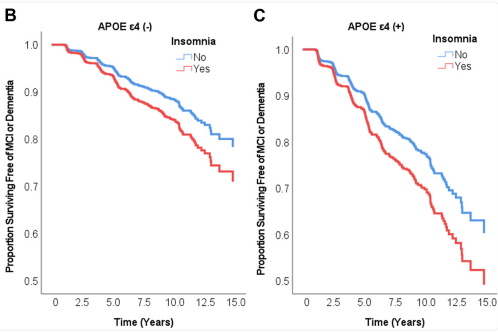 APOE ε4遺伝子を持つ人で不眠がある場合、認知症の発症リスクが大幅に高まる ことを示しています。