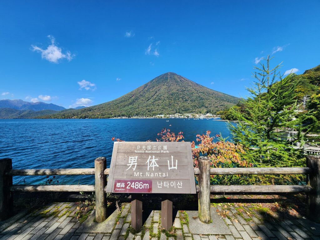 中禅寺湖のほとりからは男体山が綺麗に見えました。、