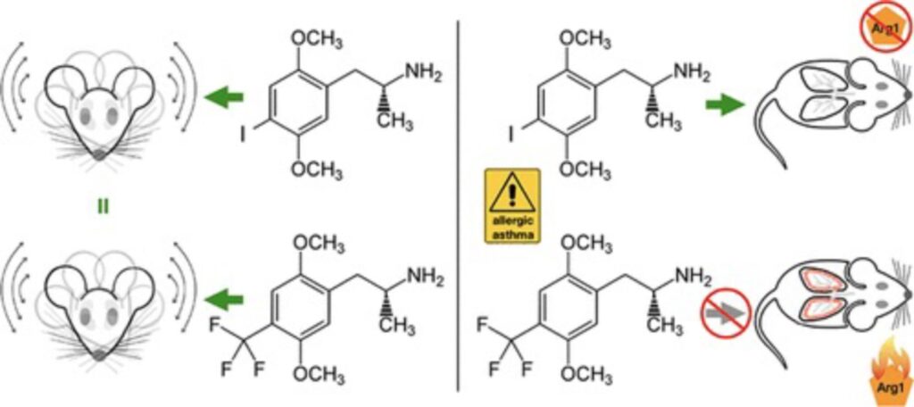 例えば、動物実験で気管支喘息モデルを用いた研究では、(R)-DOI、(R)-DOTFMという二つの化合物がいずれも類似した幻覚様作用を示したにもかかわらず、抗炎症作用は一方の薬にしか認められませんでした。