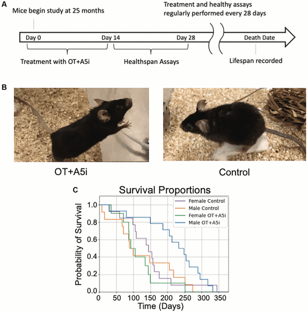 「虚弱な高齢雄マウスにOTとA5iを併用したところ、その時点からの寿命が驚くべきことに73%延長し、中央値寿命も14%増加した」