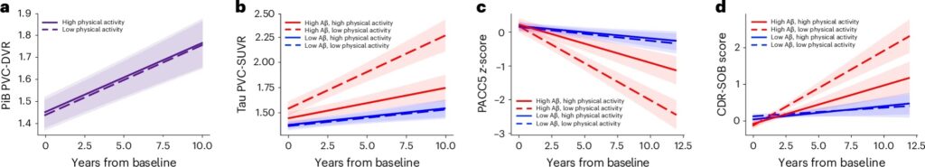 Fig. 1: Associations of baseline physical activity with longitudinal Aβ, tau and cognition.より