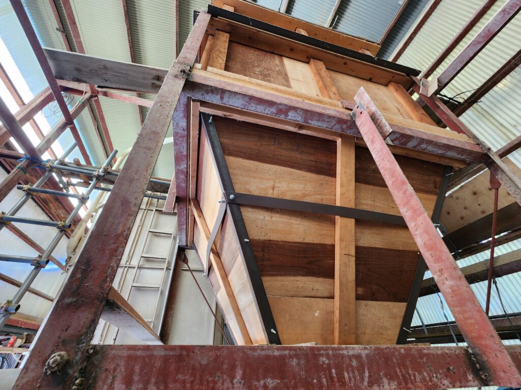 この木組の装置は、乾燥後の籾を送り出すタンクです。
