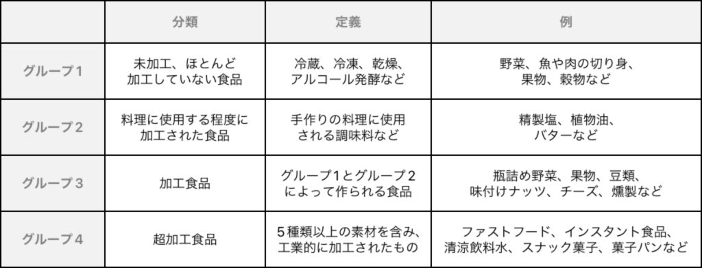 これらの食品は加工度が高く、Nova分類で“グループ4”に当たる食品に該当します。