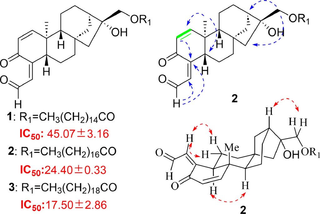 その後、セミ分取HPLCによる精製を経て、これまで報告例のない3種類のジテルペンエステルが単離されました。