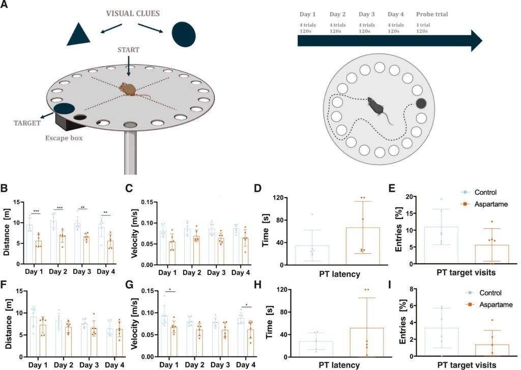 アスパルテームを摂取したマウスは、記憶や学習能力を評価する課題において成績が低下し、迷路実験では動きが遅く、脱出までに要する時間も長くなる傾向が見られました。