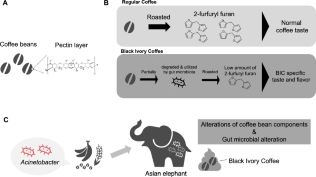 この知見から研究者たちは、ゾウの腸内マイクロバイオームも、Black Ivory coffee の風味形成に同様の影響を与えているのではないか」と予想したようです。