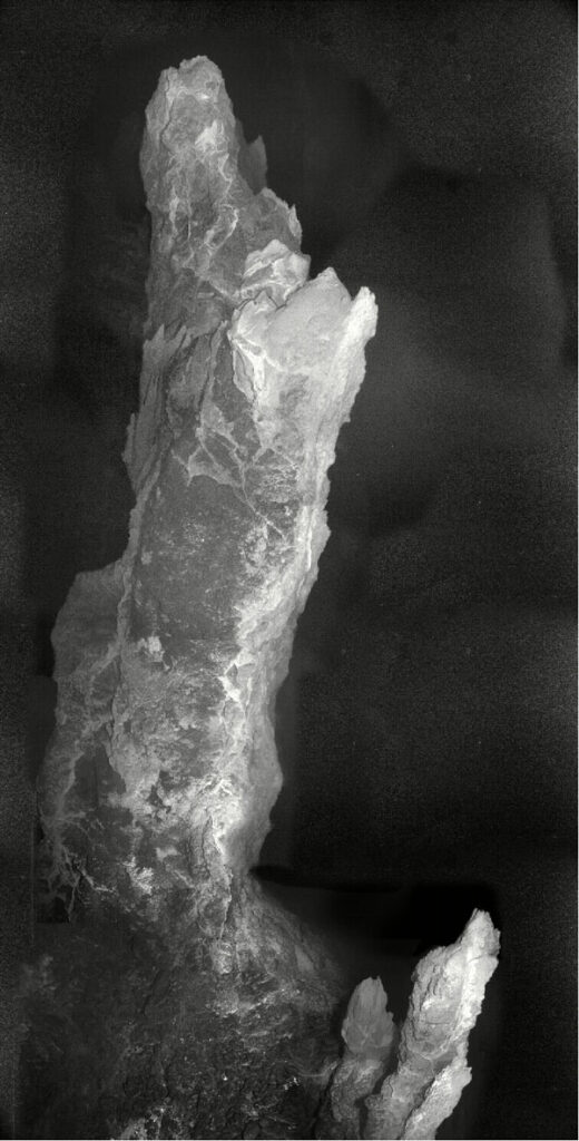 そこには、暗闇の中からそびえ立つ無数の塔や柱が存在し、遠隔操作無人探査機(ROV)のライトに照らされると、淡い青白い光を帯びた幽霊のような姿を浮かび上がらせます。