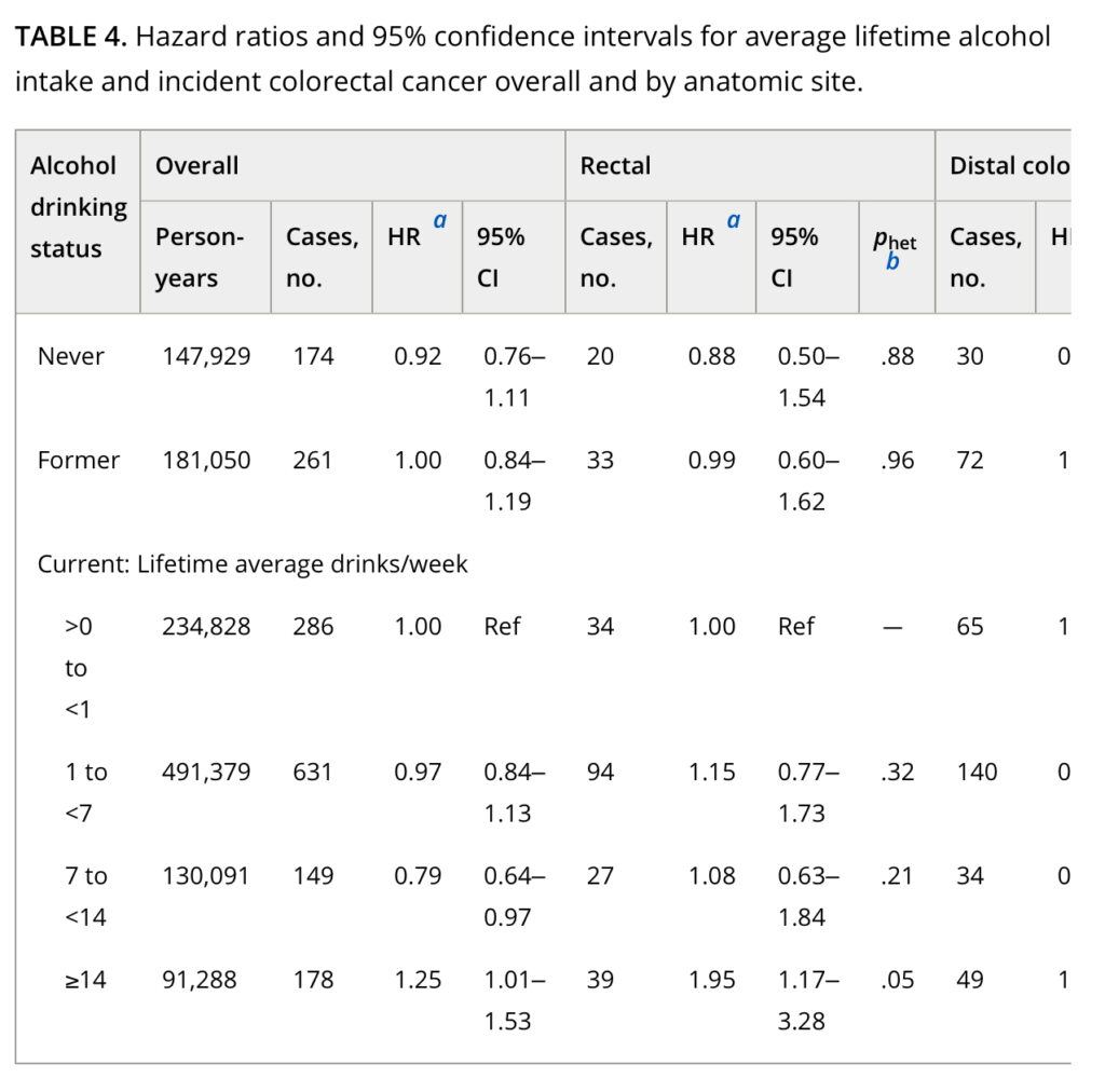 本研究の興味深い傾向として、中等度(週 7~14 杯未満)の平均飲酒者が(軽度飲酒者と比べて)大腸がんリスクが低い傾向にあったという結果も報告されています。