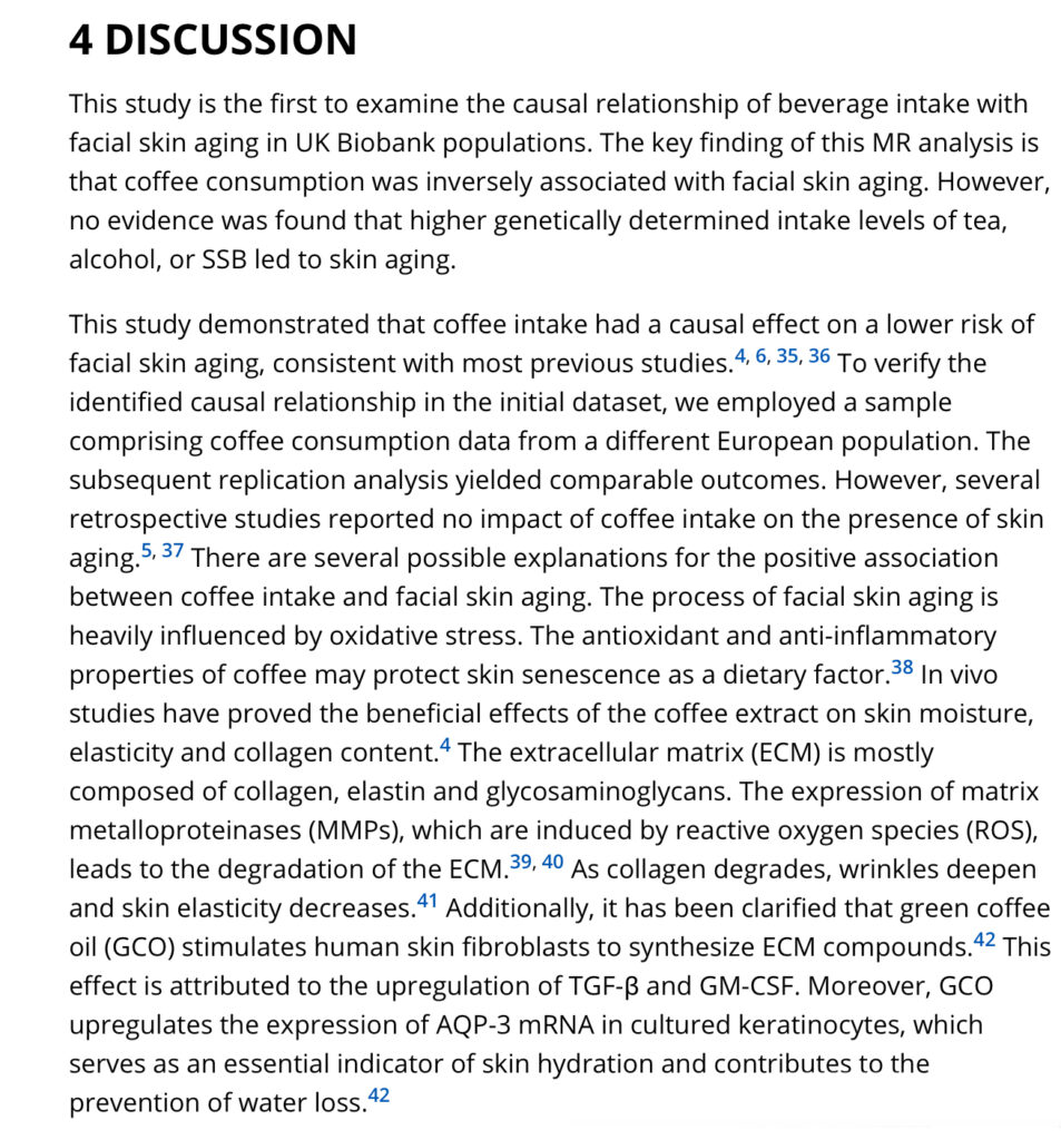 その結果、コーヒー摂取は顔の皮膚老化リスクを低下させる可能性が示されました。