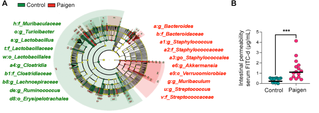 このPaigen食を与え続けた結果、腸内細菌叢のバランスが大きく変化し、ブドウ球菌(Staphylococcus)やバクテロイデス(Bacteroides)など特定の菌が増加し、ラクトバチルス(Lactobacillus)が減少するというディスバイオーシスが確認されました。