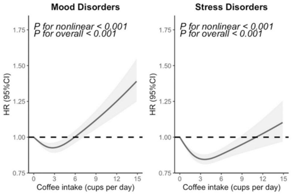 このように、コーヒーの摂取量と精神疾患リスクの関係は、単純な比例関係ではなく、いわゆる「Jカーブ」を示していました。
