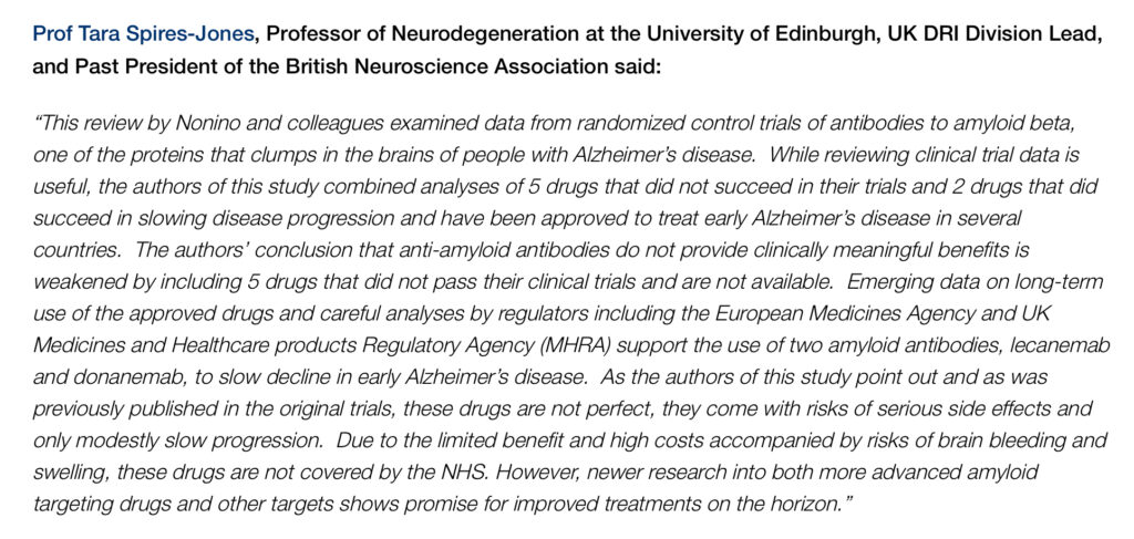 UK Dementia Research Institute responds to Cochrane review suggesting anti-amyloid Alzheimer’s drugs show no clinically meaningful effectより
