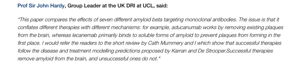 例えば、1990年代にアミロイド仮説を提唱したイギリスの生物学者John Hardy氏は、この研究を強く批判しています。